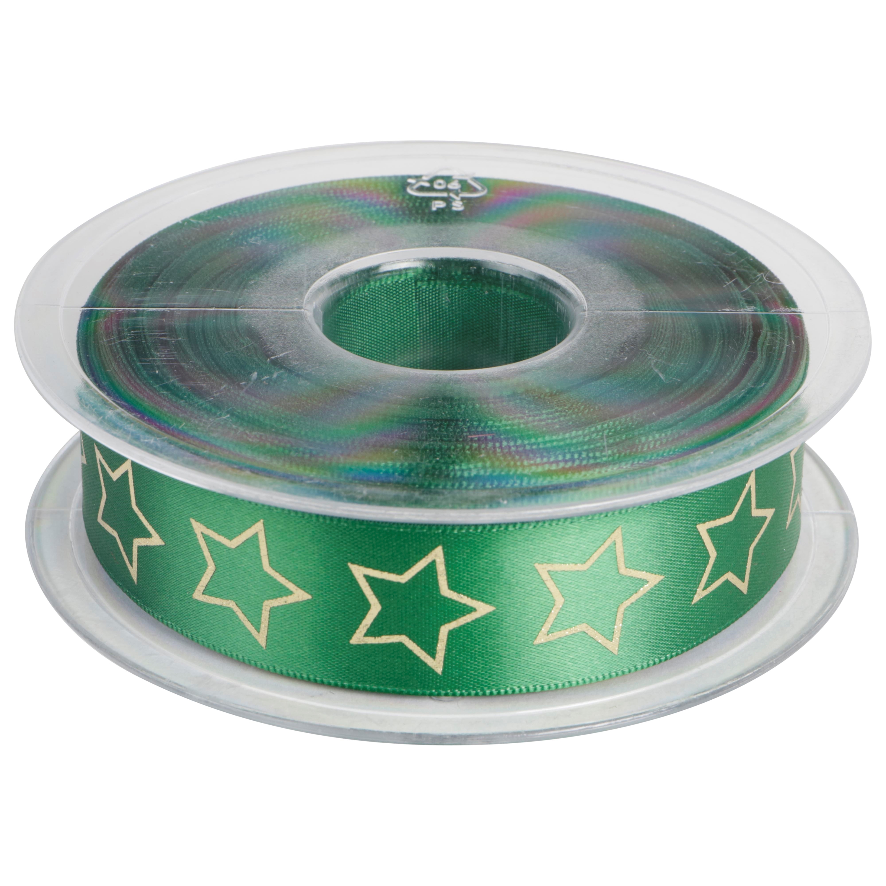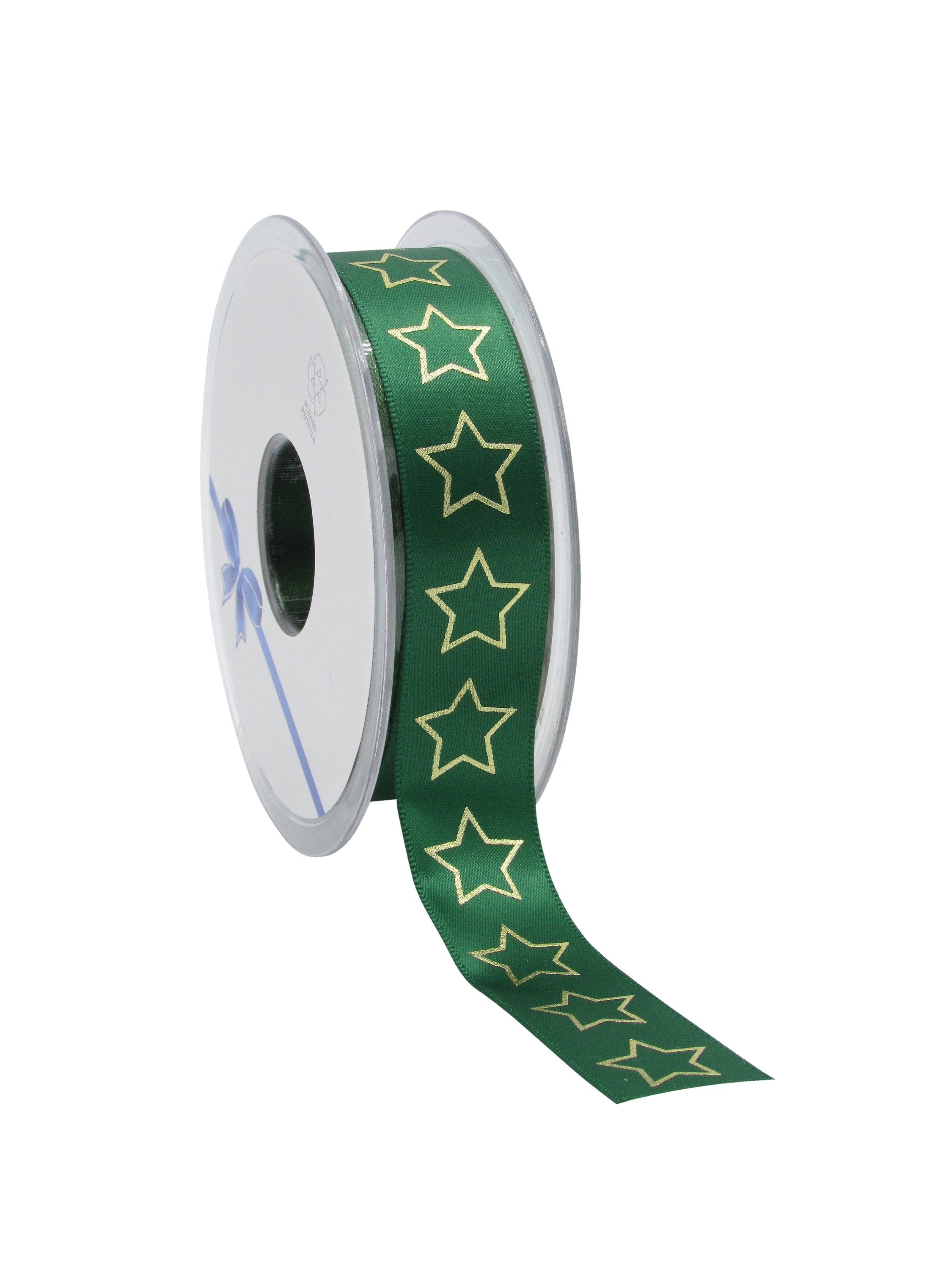 Rol kerstlint satijn 23 mm 25 mtr groen Sterren (uc)