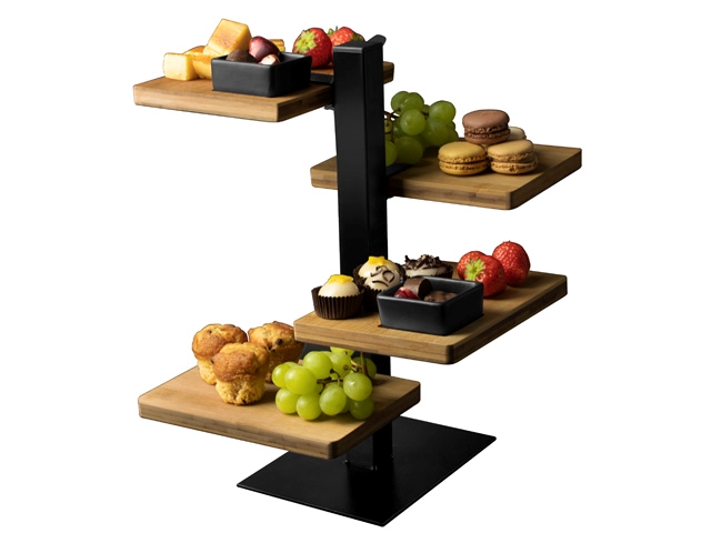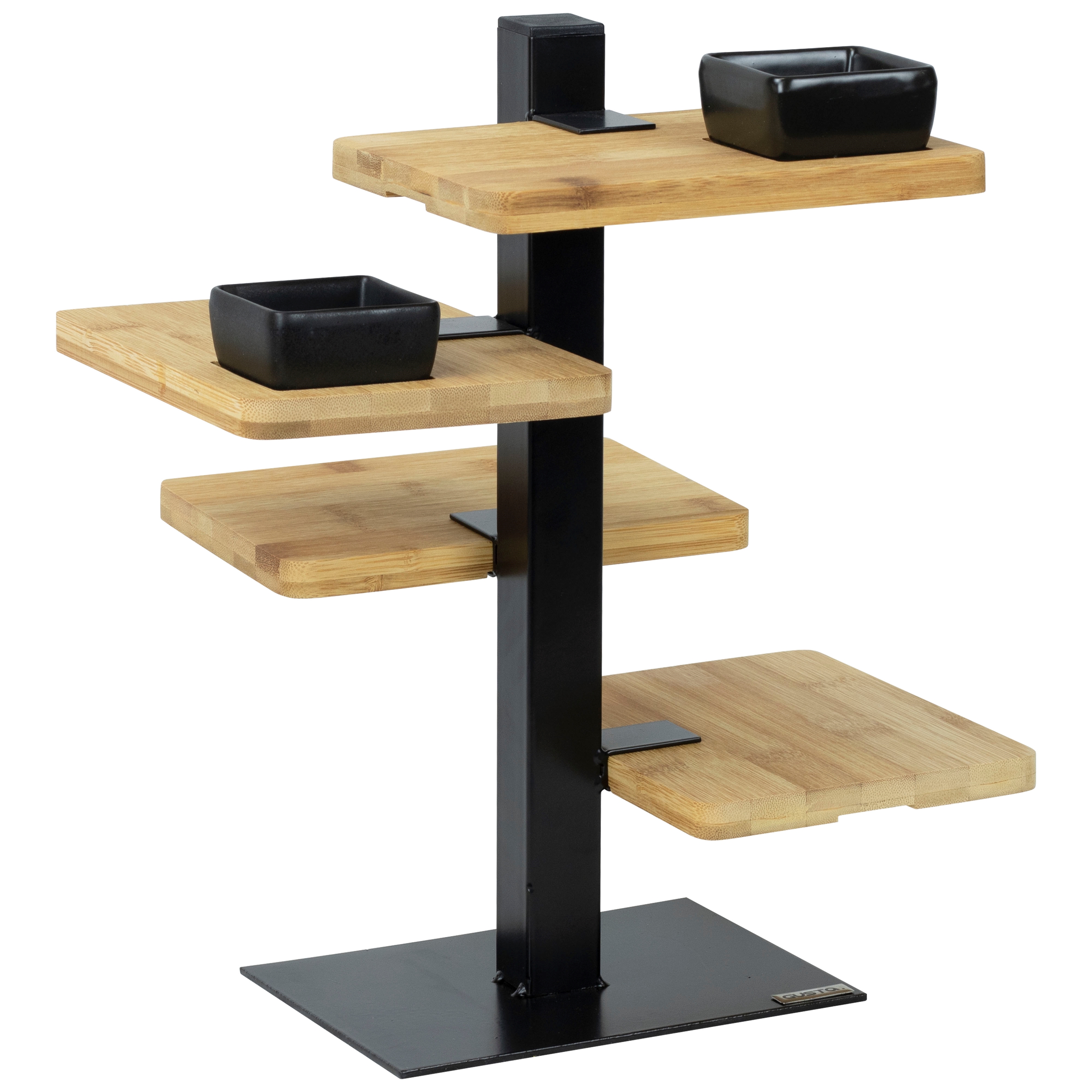 Serveertray 4 laags met bamboe plankjes en twee zwarte keramieken bakjes (uc)