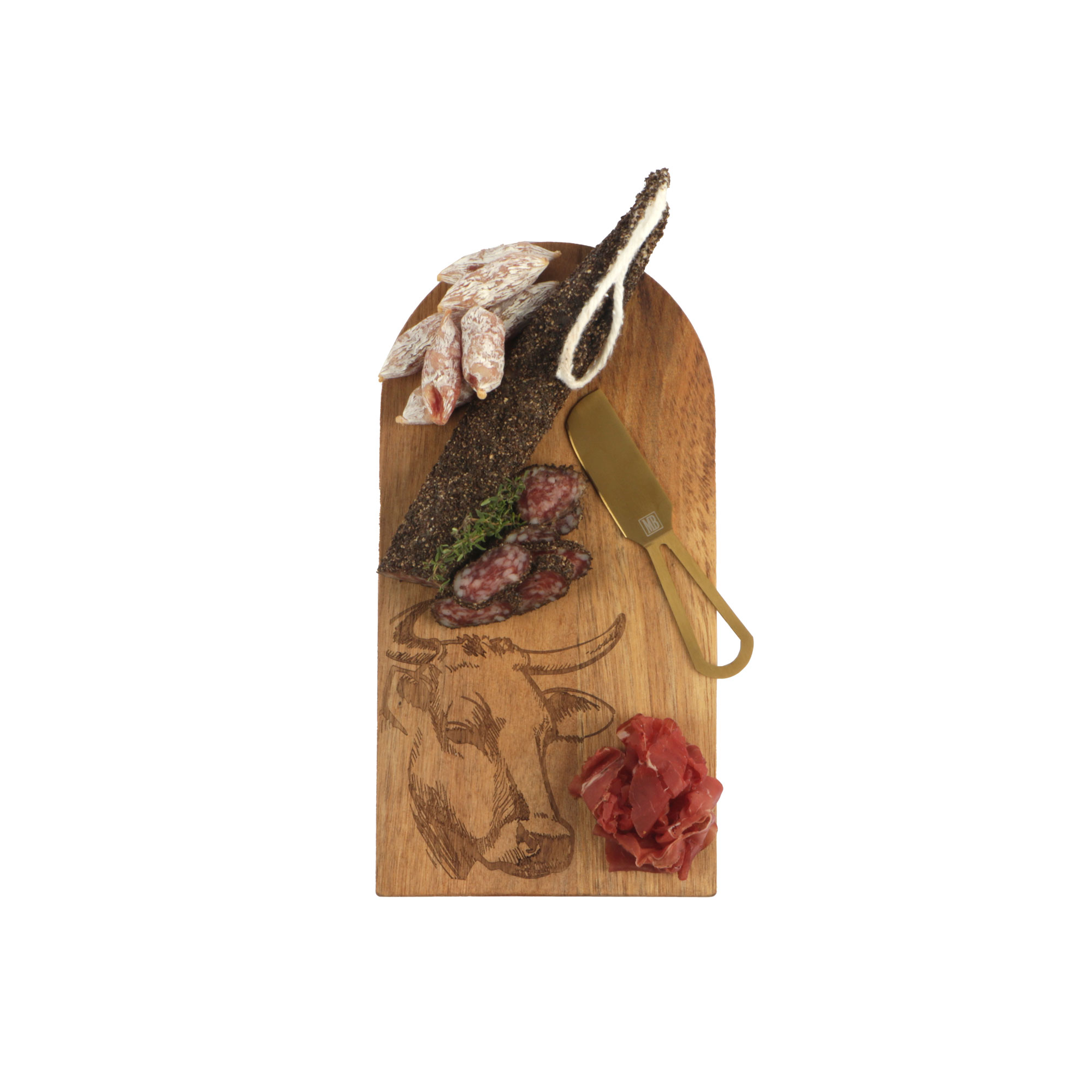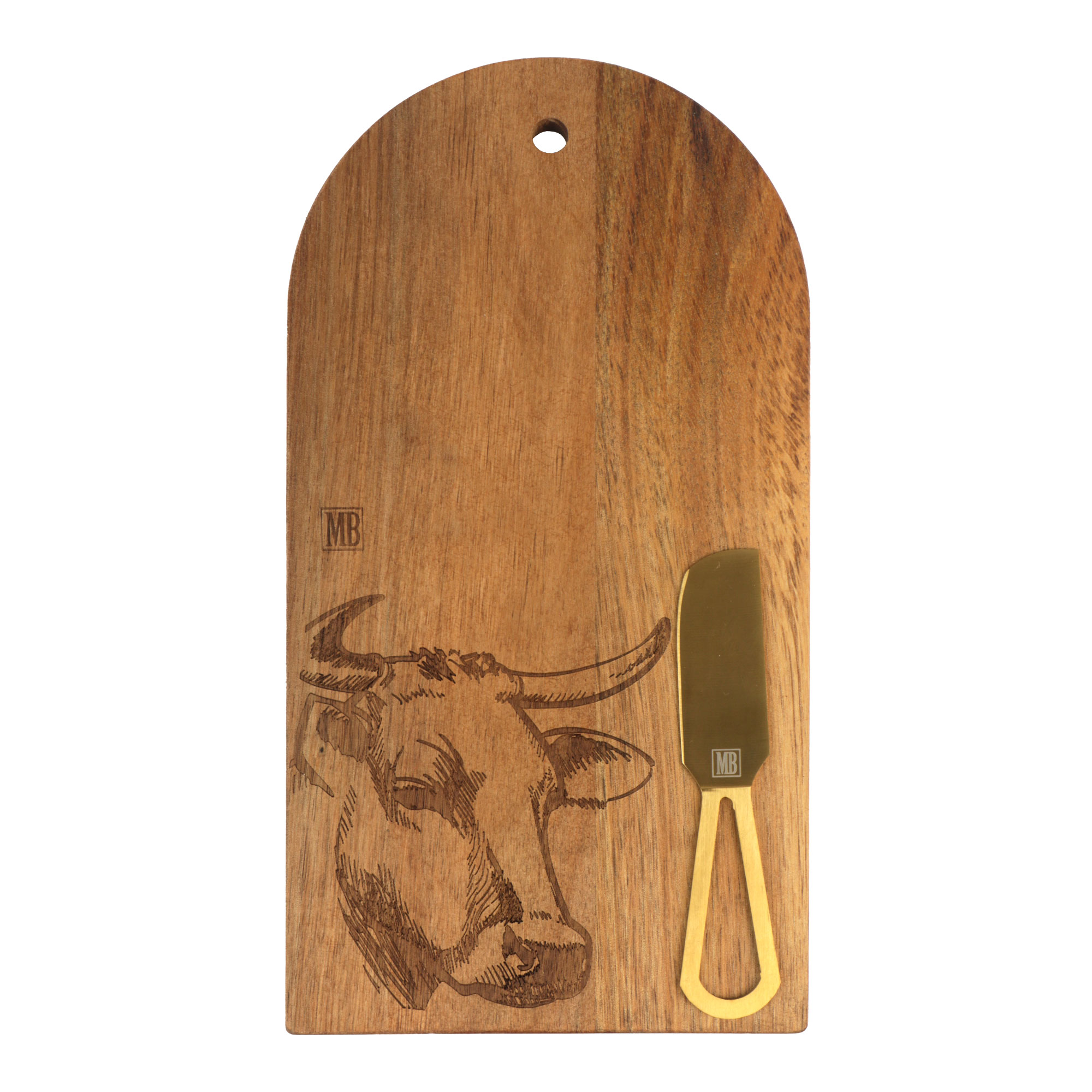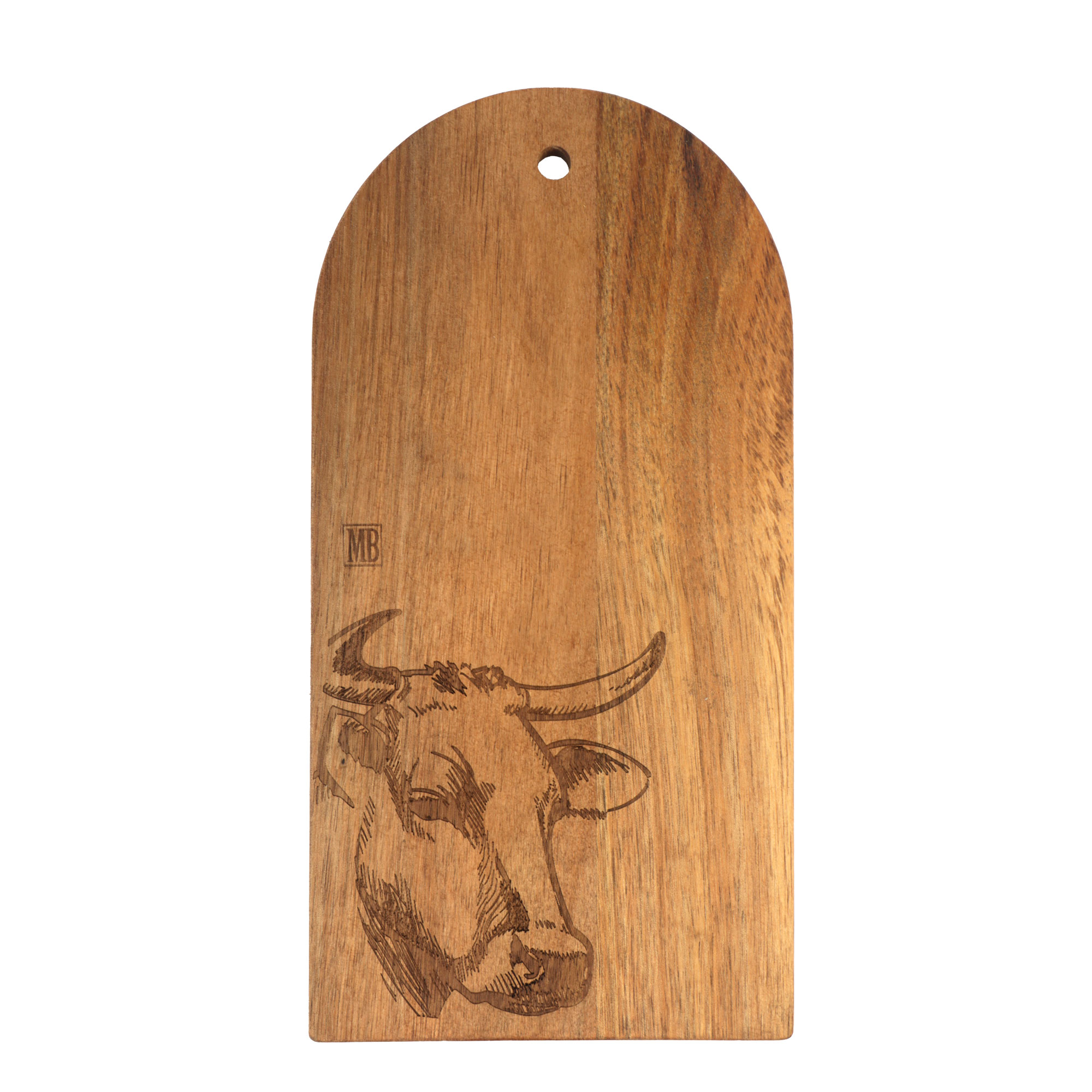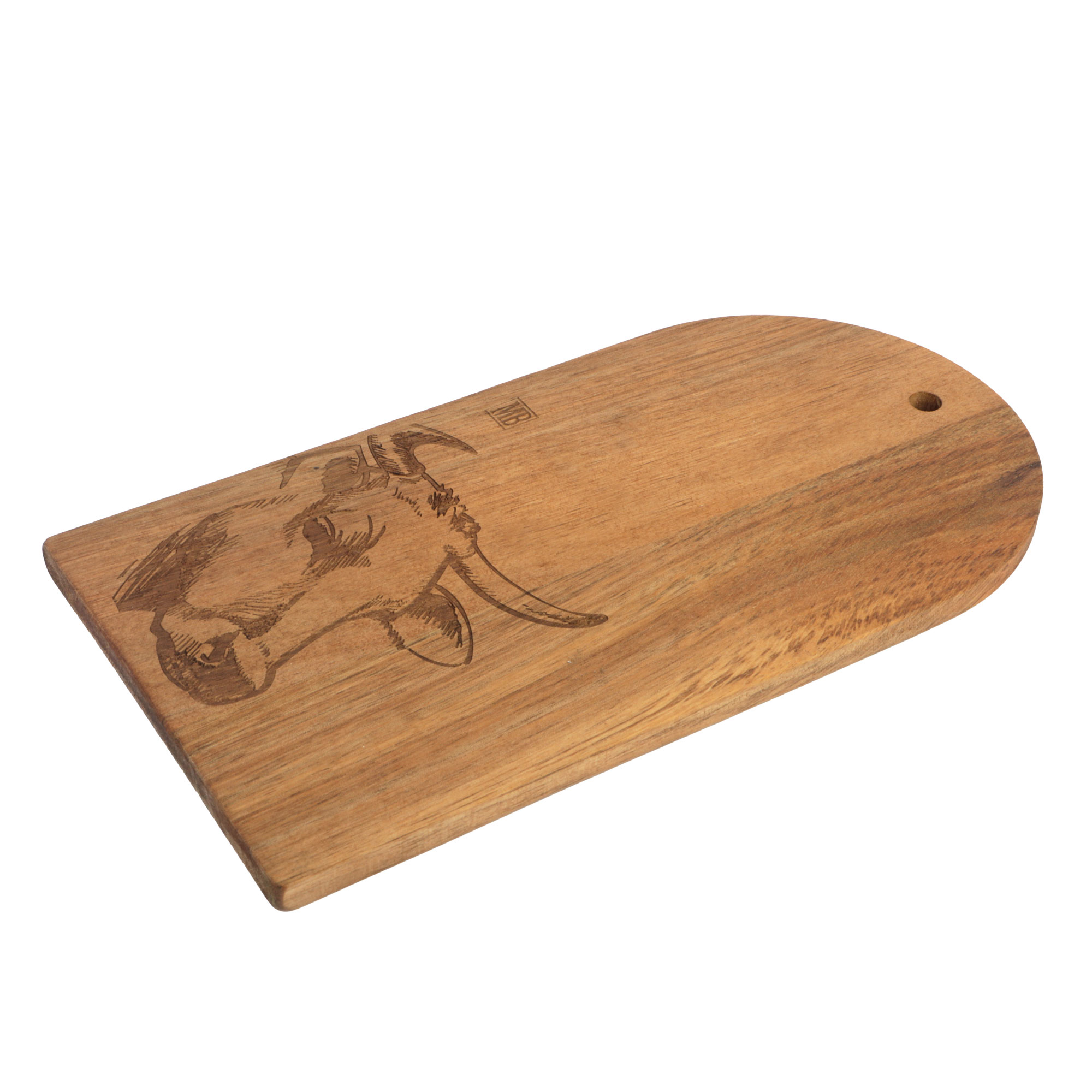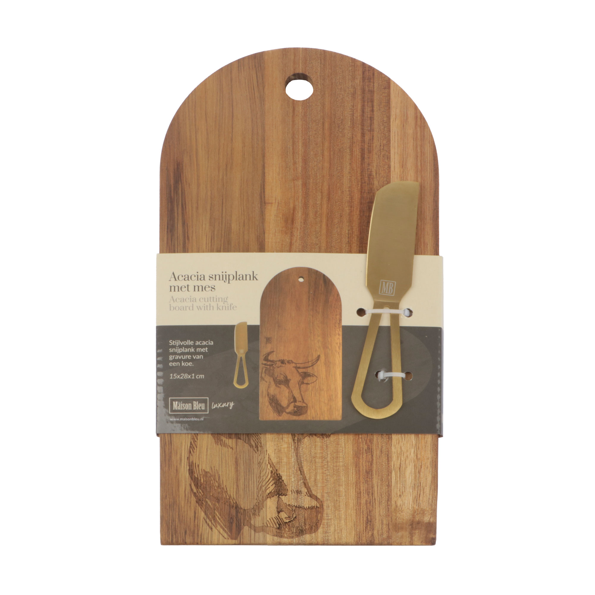 Acacia snijplank 15x28x1 cm met mes en gravure koe (uc)