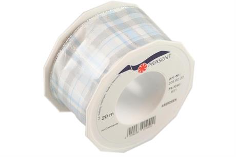 Rol textiellint 60 mm 20 mtr lichtblauw/zilver/wit geblokt met draadrand