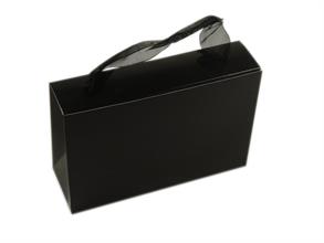 Tasje van 250grs white art-board met100% zwart glans opdruk, gelamineerd en afgewerkt met zwart organza lint 25mm breed en 40 cm lang.