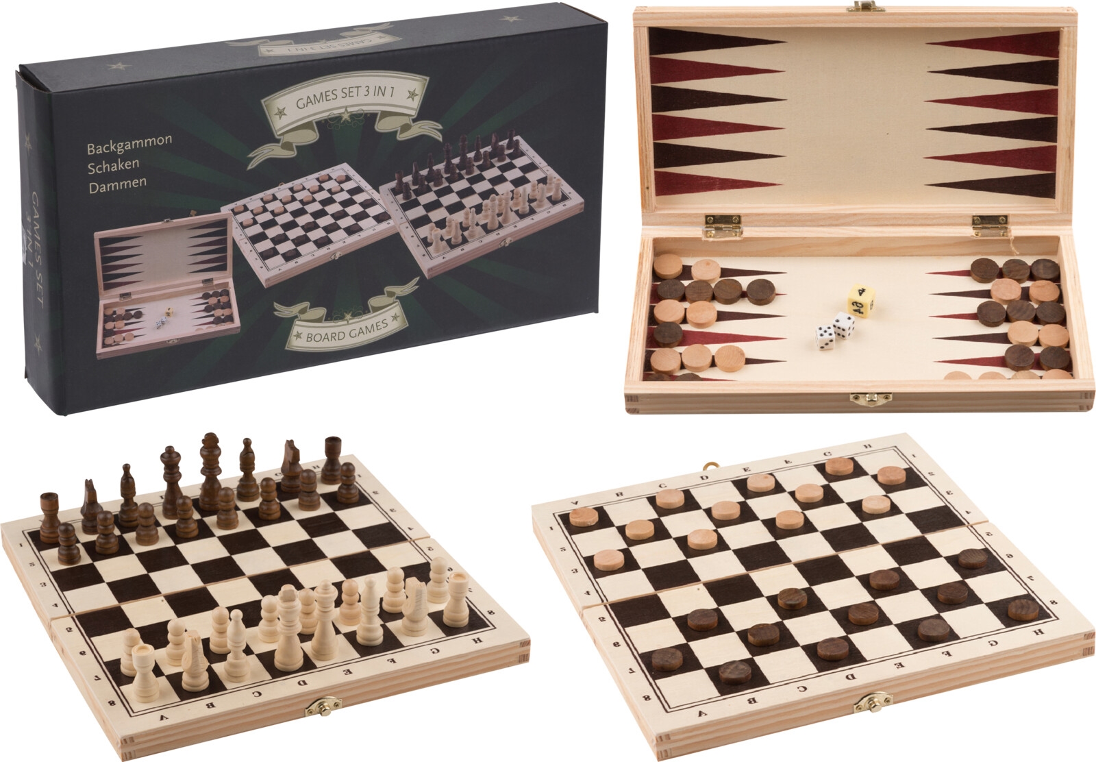 Houten speldoos 3 in 1 dammen schaken backgammon (ucl)