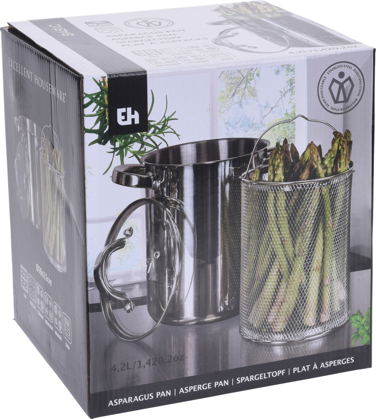 De deze handige asperge pan zorgt ervoor dat de asperges rechtop bereid kunnen worden. De uitneembare mand maakt het handig om de gekookte asperges uit de pan te halen.