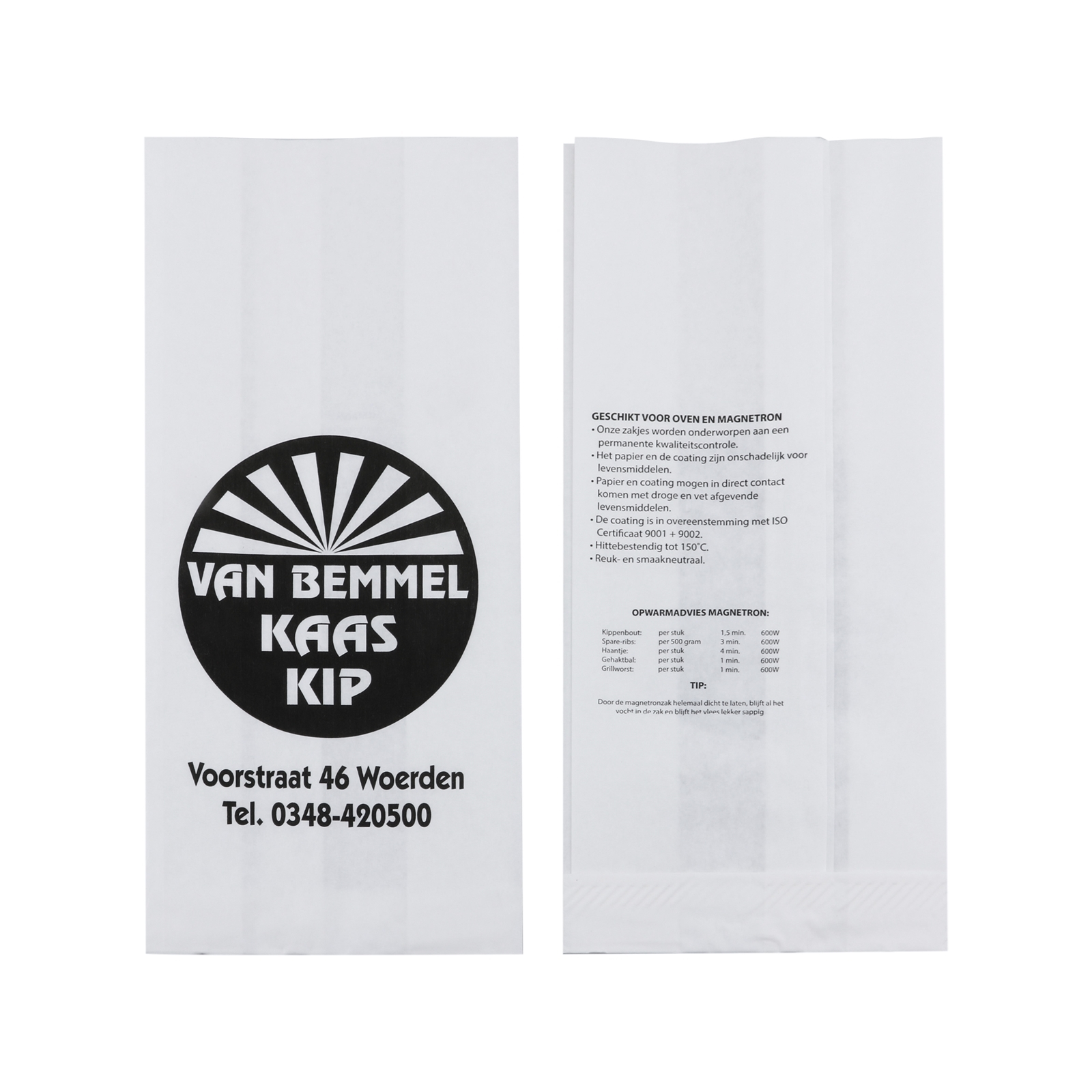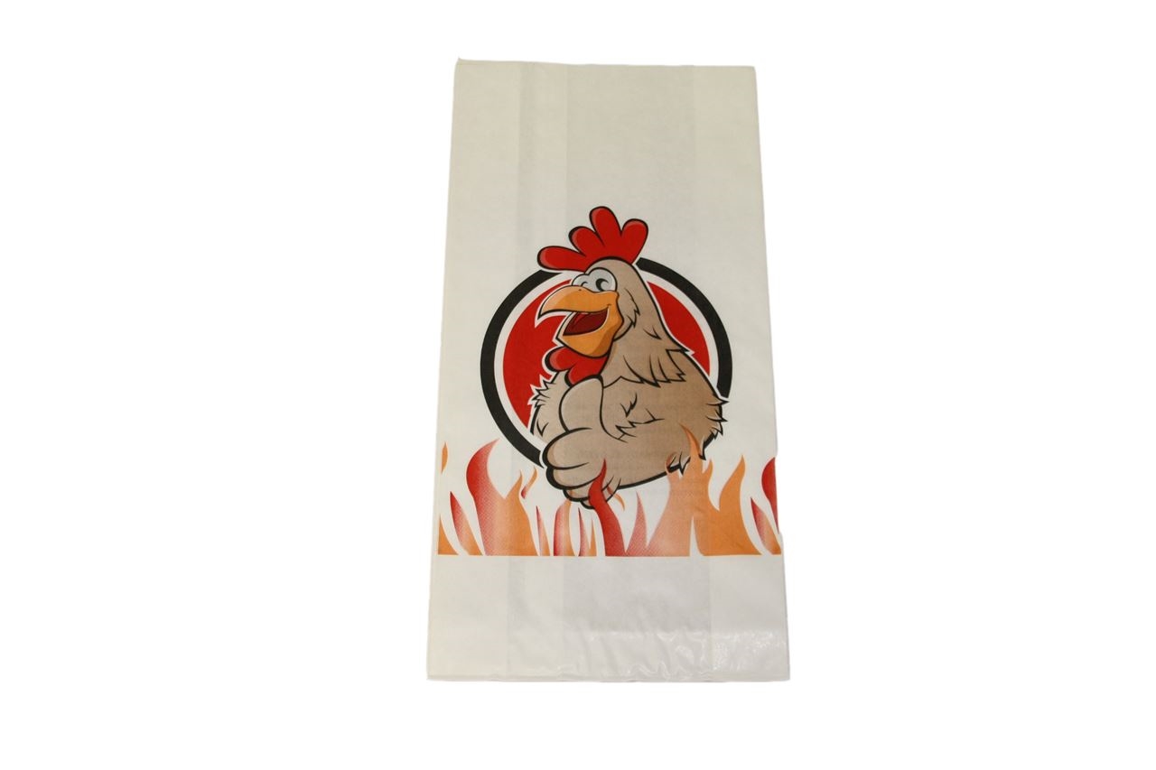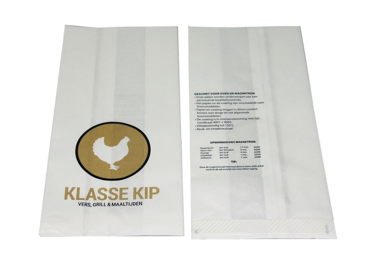 Bedrukte kipzakken voor een 1/2 kip of een 1/1 kip worden vaak bij de poelier meegegeven om kip warm te houden tijdens uw rit naar huis.
