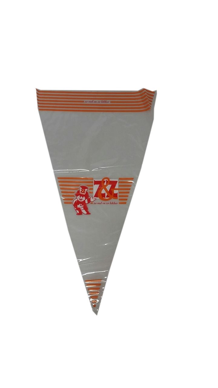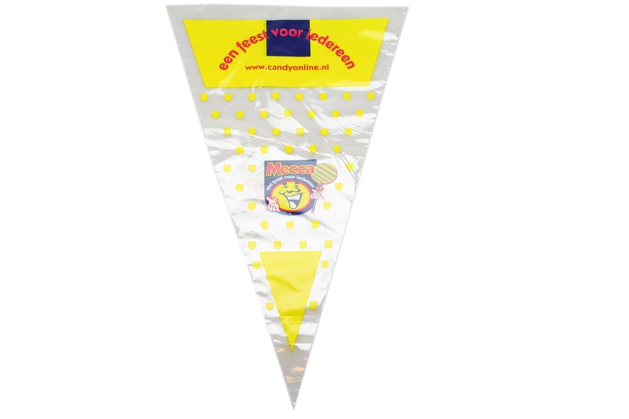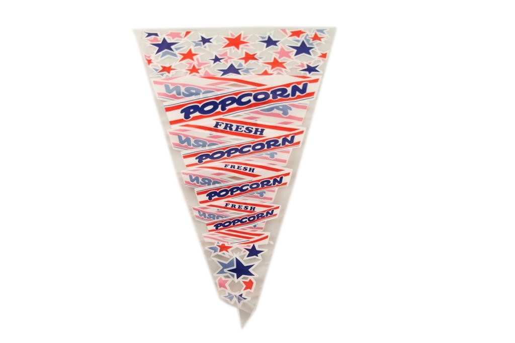 Bedrukte puntzakken boor het verpakken en presenteren van diverse soorten snoep of popcorn.