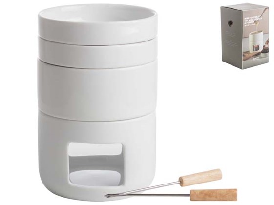 Makkelijker gaat het niet worden met deze mini fondue set van Gusta! Deze set voor 2 personen staat garant voor gezellige en smaakvolle avondjes. De set bestaat uit een kleine ronde rechaud, een fondue schaaltje, 2 kleine bordjes en 2 fondue vorken. Leuke is dat alles stapelbaar is dus makkelijk op te bergen. Voor de traditionele fondue maar ook voor chocolade- en kaasfondue. Smakelijk!