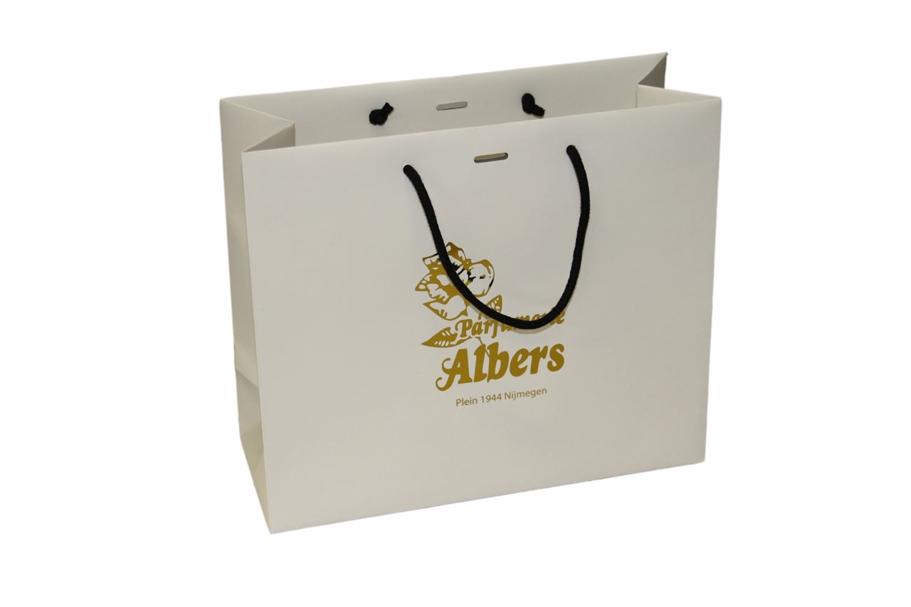 Stijlvol, geraffineerd en chic. Zo laten deze luxe papieren tassen zich het best omschrijven. De ideale luxe tas voor de mode- en schoenenbranche. Maar ook de parfumerie heeft deze schitterende luxe draagtas al ontdekt vanwege zijn sublieme uitstraling. Het bedrukken van de binnenzijde, de tas voorzien van een mat laminaat, reliëfprint of foliedruk, het is allemaal mogelijk. Mooi tot in detail en zeer onderscheidend. Mogelijk vanaf 1000 stuks.