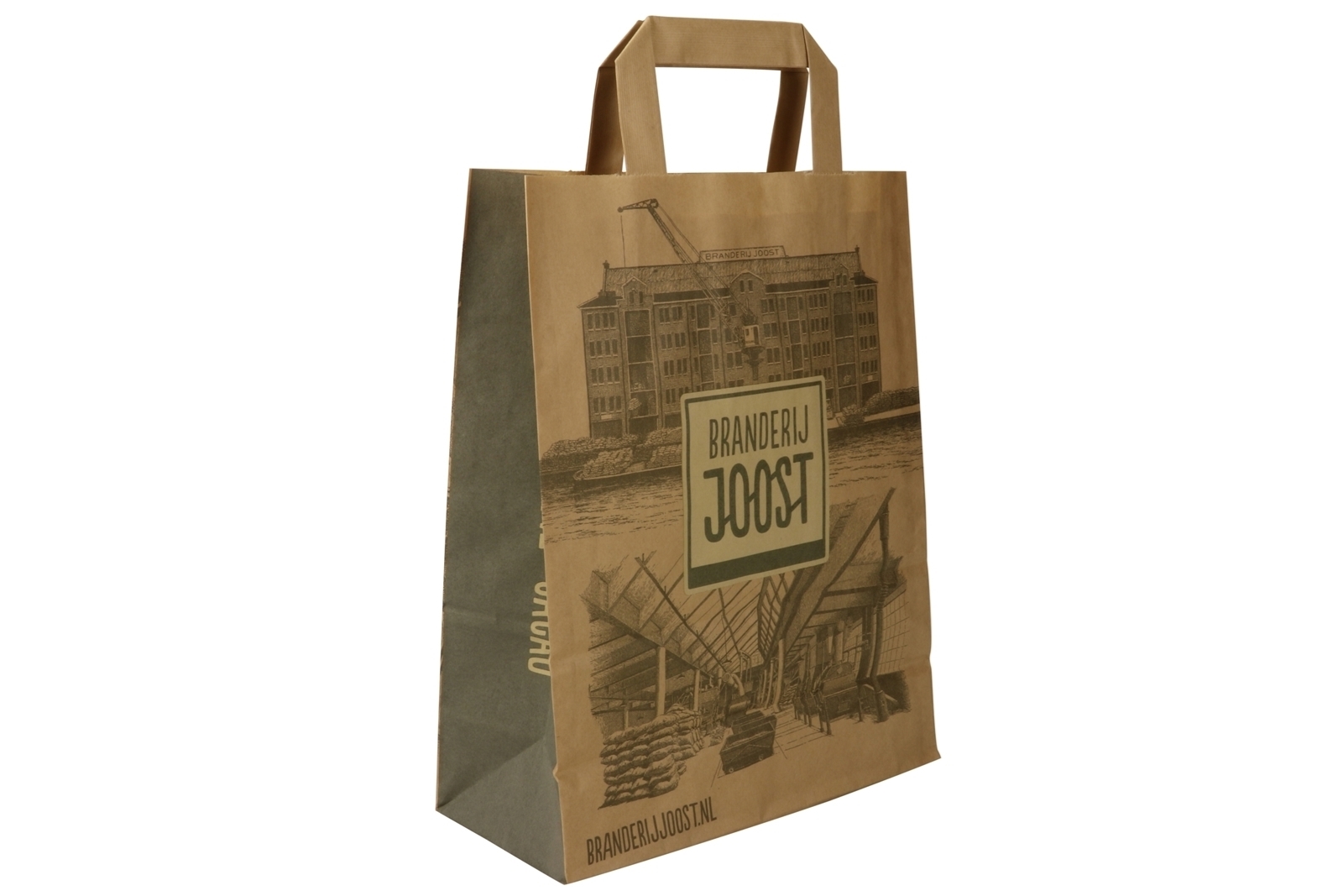 Papier heeft een krachtige en natuurlijk uitstraling. Deze papieren tassen zijn leverbaar in vele uitvoeringen en vrijwel elke kleur. Te bedrukken van één kleur tot full color. U heeft keuze uit diverse kwaliteiten papier en nog meer afmetingen. Met gedraaide handvatten, een platte greep of een uitgestanst handvat maakt u de draagtas helemaal af naar uw wensen. Papieren tassen met platte greep vanaf 3.000 stuks bedrukt met uw naam leverbaar.